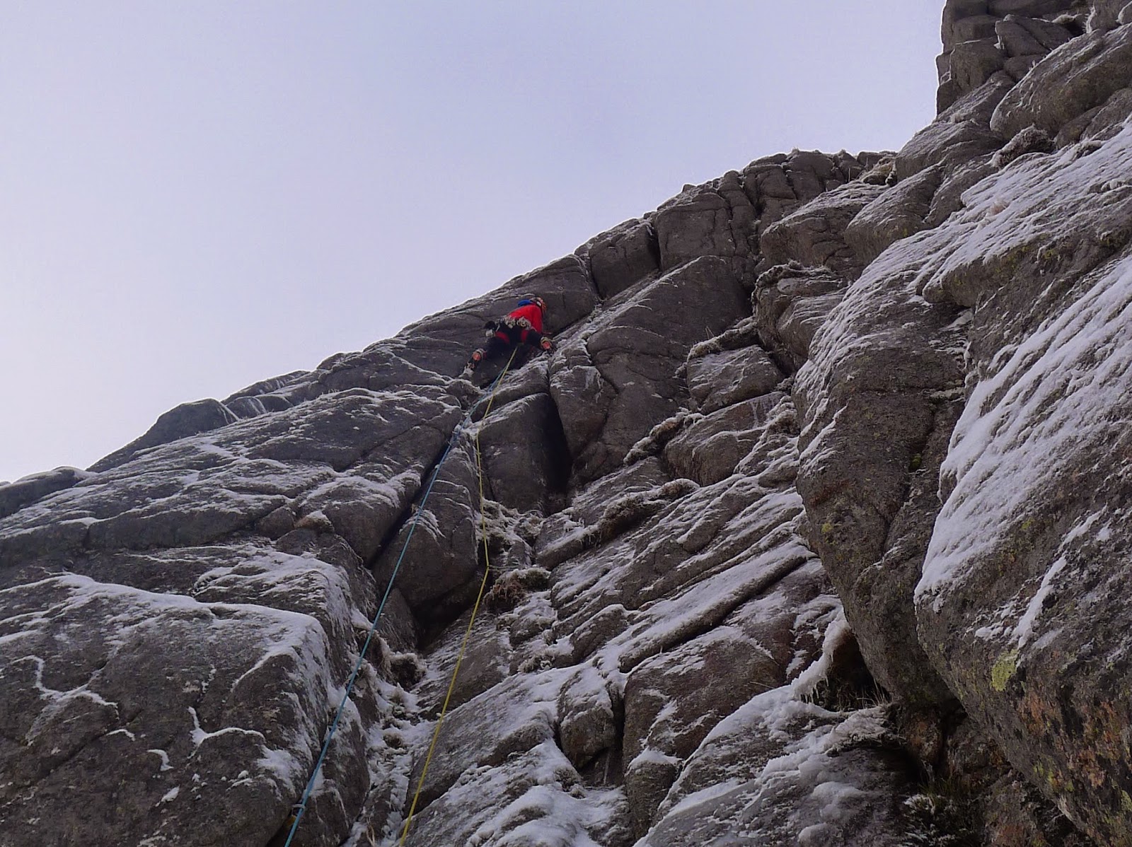 The best climbing I've done so far this season was just after Christmas. Dougie, Adam and myself went up to Glencoe for a few days climbing. Dougie has a van that can sleep 3 folk, so it's pretty handy for wee trips like that. The first day we headed up very early to the lost valley buttress to climb Neanderthal VII,7. I had never been up there and had wanted to climb this route for a while. The weather was perfect but really cold. The route mainly consists of 3 pitches. Dougie went first which was easy to start with but then finished with a thin traverse.